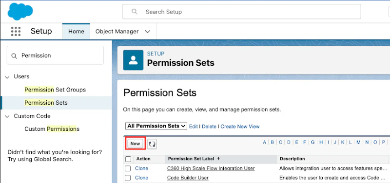 - Navigate to Permission Sets and select New to create a new permission set “Oleria Access”