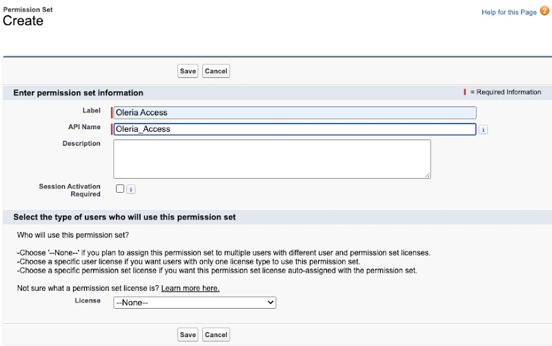 - Give Label as “Oleria Access” and API Name as shown below, save the permission set.