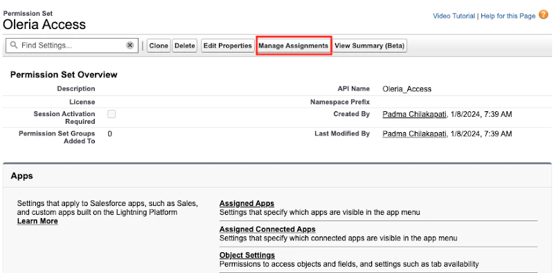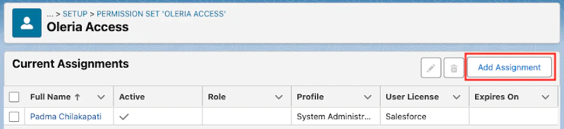 - Open Oleria Access Permission set, select Manage Assignments to assign a user