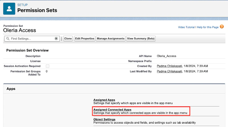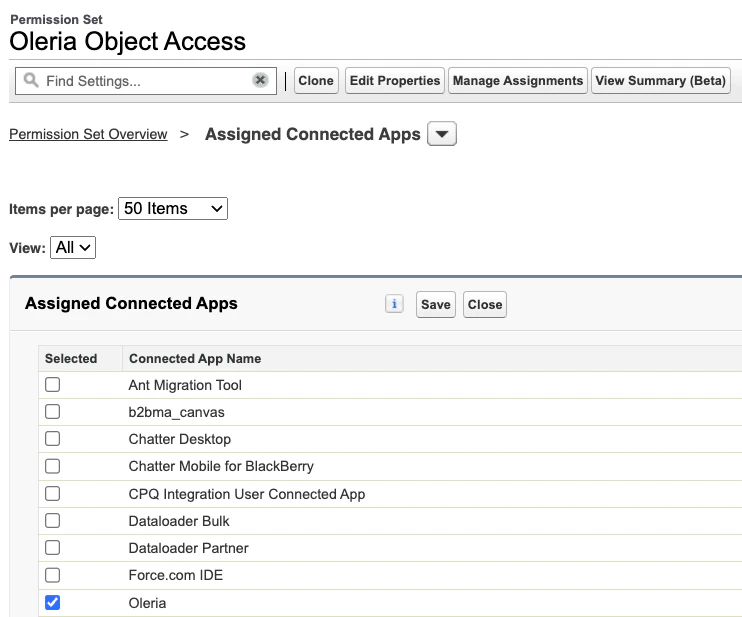 - Open Oleria Access Permission set, select “Assigned Connected Apps” to add “Oleria” app to the Oleria Access permission set