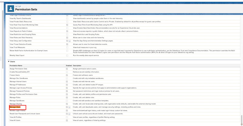 - To ‘disable account’, enable Manage Users under permission sets
