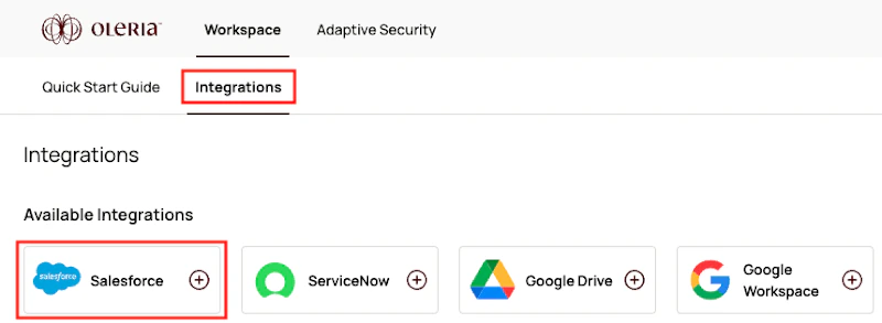 - Goto your Oleria workspace, select Integrations → select Salesforce