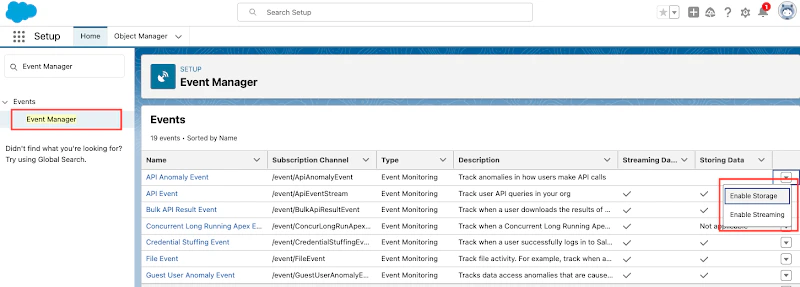 Oleria recommends enabling and configuring Event Monitoring (Shield) in your Salesforce instance. This helps capture all users’ activities and provide insights into them. Without event monitoring (Shield), the user activity insights are limited to login and logout activities. Follow these steps to enable storage and streaming for the events from the Event Manager.- Select Set up → search Event Manager -> Enable storage and Enable streaming for all the events
