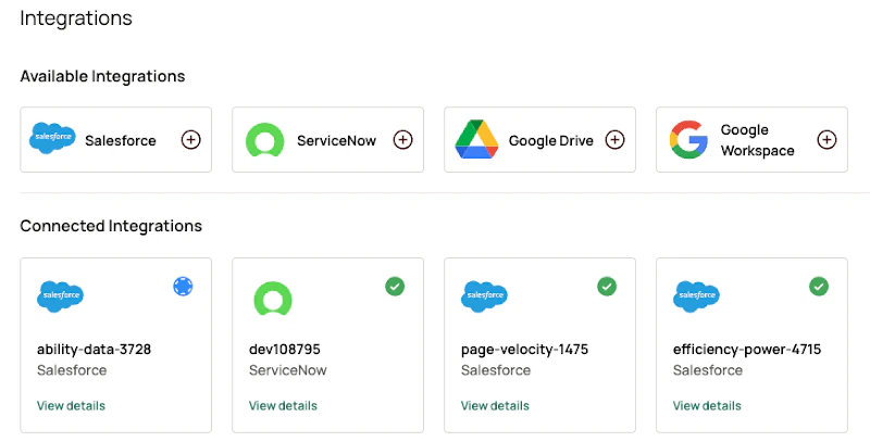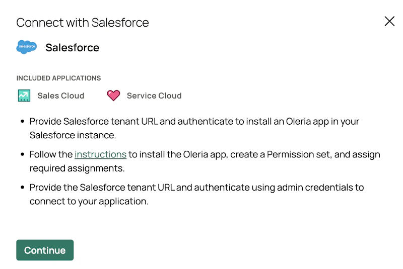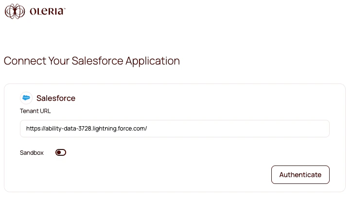 - You can find a newly integrated Salesforce instance in your Oleria workspace connected integrations