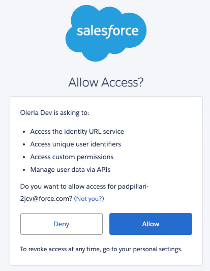 - Authorize Oleria access to create a connected app called “Oleria” in your Salesforce application.
