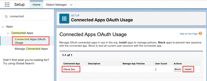 - Login to your Salesforce application, search “Connected Apps OAuth Usage”, select “Oleria” app and click Install