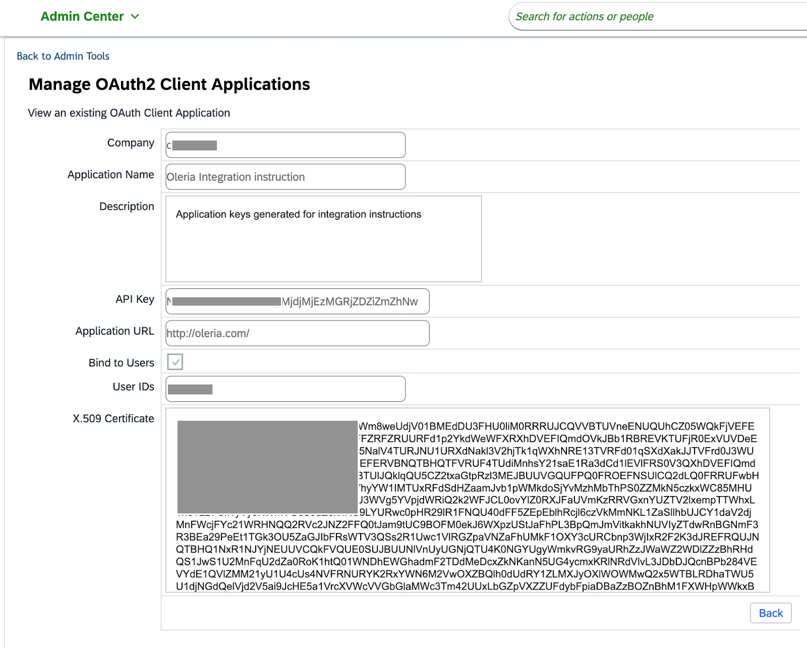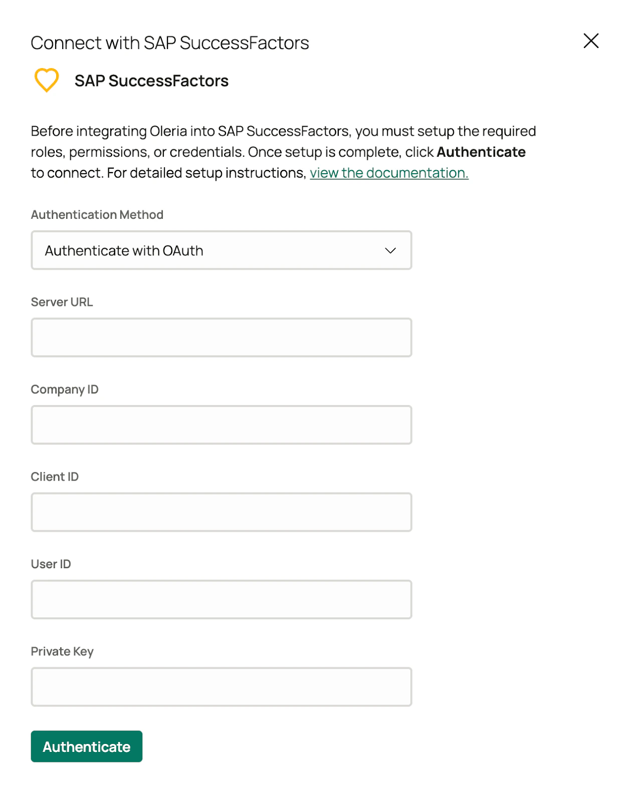 - Integration service user with admin privileges in Success Factors for connecting with Oleria