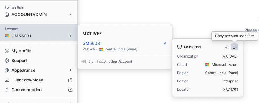 - Account Identifier: Copy your instance Account Identifier copied in step 2 above. It would be in the format: <org-name>.<account-name>