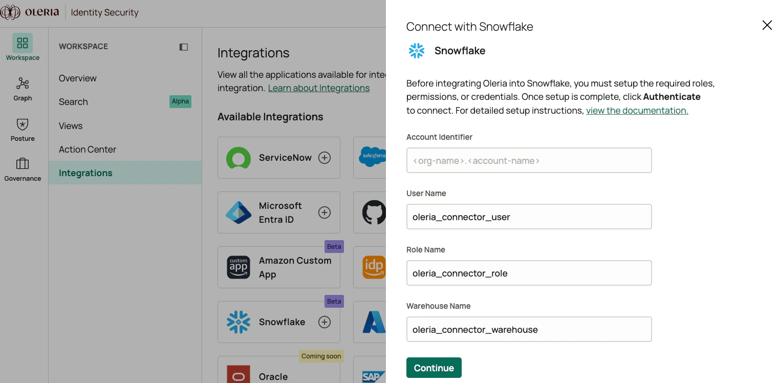 - Log into your Oleria workspace, navigate to Integrations, and select Snowflake. A side panel opens. Provide the following information and click continue