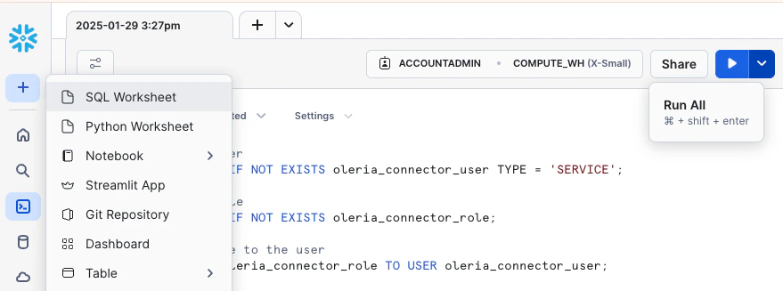 - Open the Snowflake console and navigate to SQL Worksheet. Create a new SQL worksheet. Paste the script you copied in step 4 and click Run All.