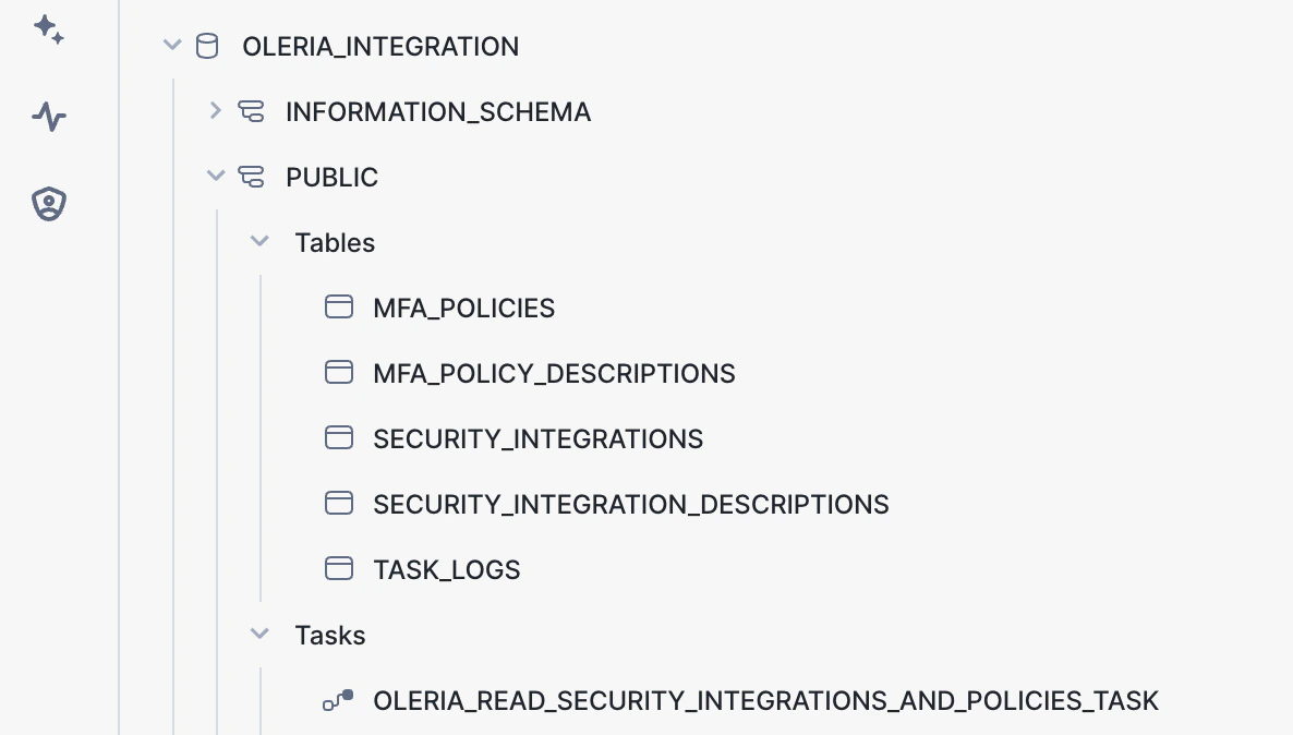 - The script creates the database, tables, and tasks, as shown in the screenshot. These tables store policies and integration metadata details, which Oleria uses to generate risks and SAML SSO insights. The task is scheduled to run hourly, ensuring the tables are up-to-date with the latest data.