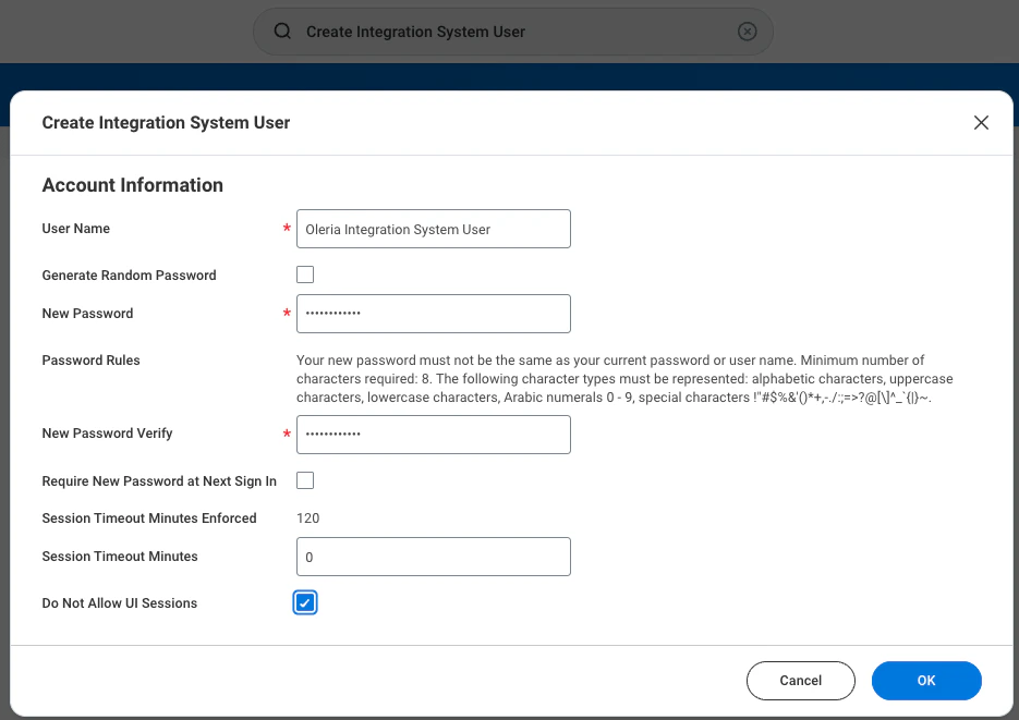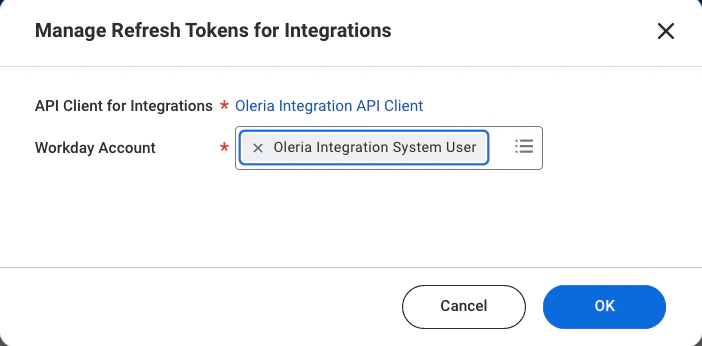 From the Integration System User, search and select the **Oleria Integration System User **created in step 1.1.