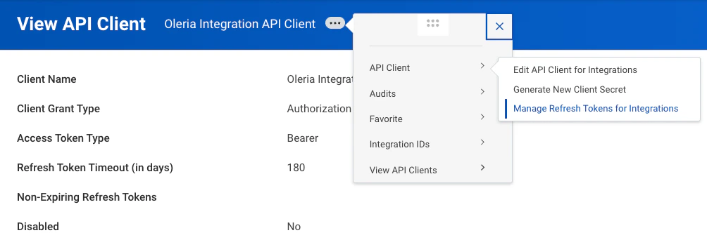 Type View API Clients in the search window and select the task. Select API Client for Integrations