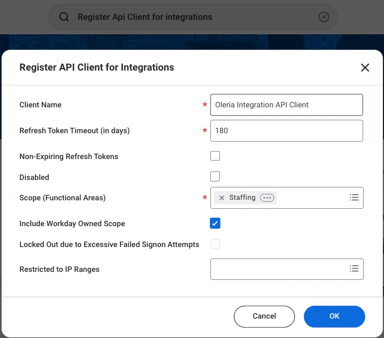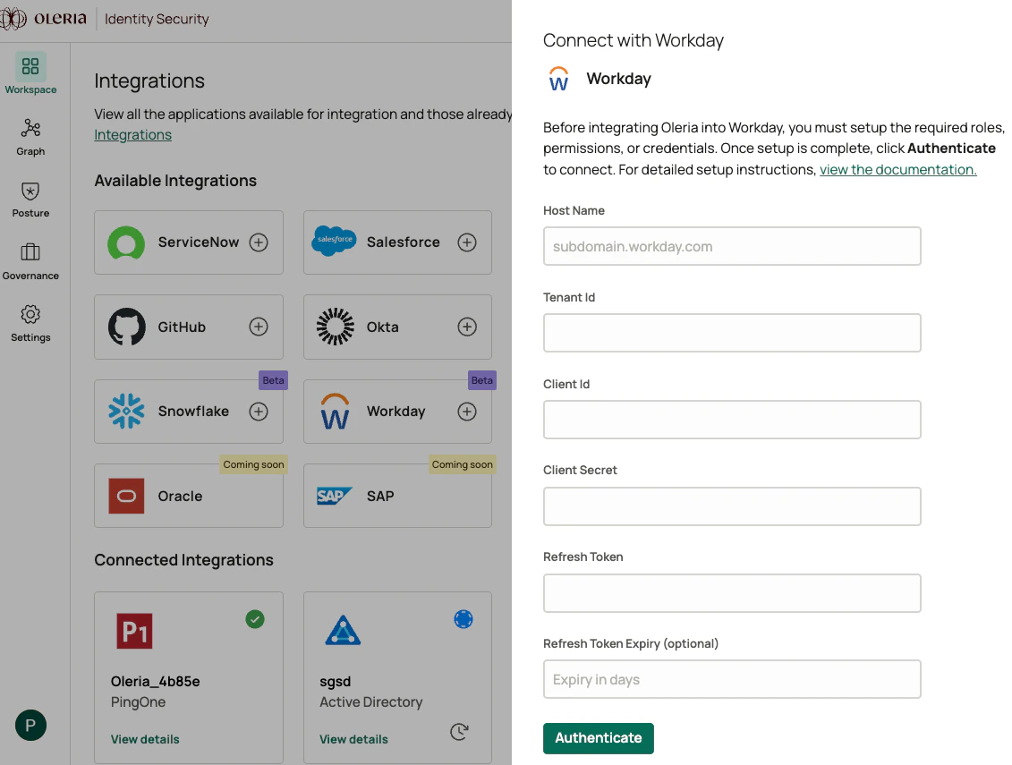 2.1. Go to your Oleria workspace, select Integrations → select Workday and provide the following
