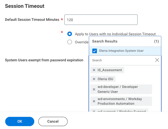 In the search windows, type Maintain Password Rules and select the task. In the System Users exempt from password expiration, search and add the **Oleria Integration System User **