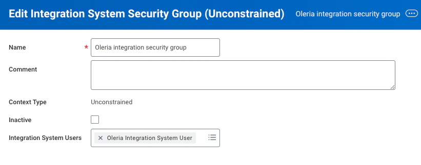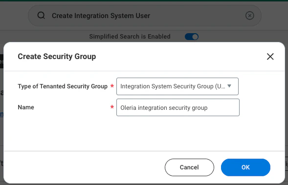 In the search window, type **Create security group **and select the task. From the Type of Tenanted Security Group dropdown, select Integration System Security Group (Unconstrained), and give a name, for example, Oleria Integration Security Group.