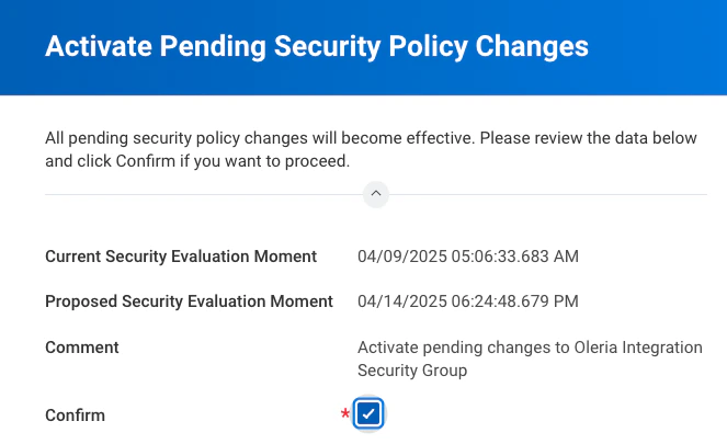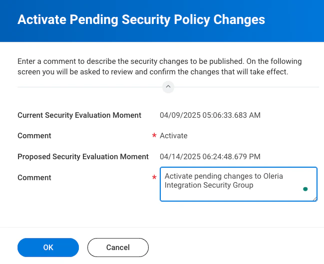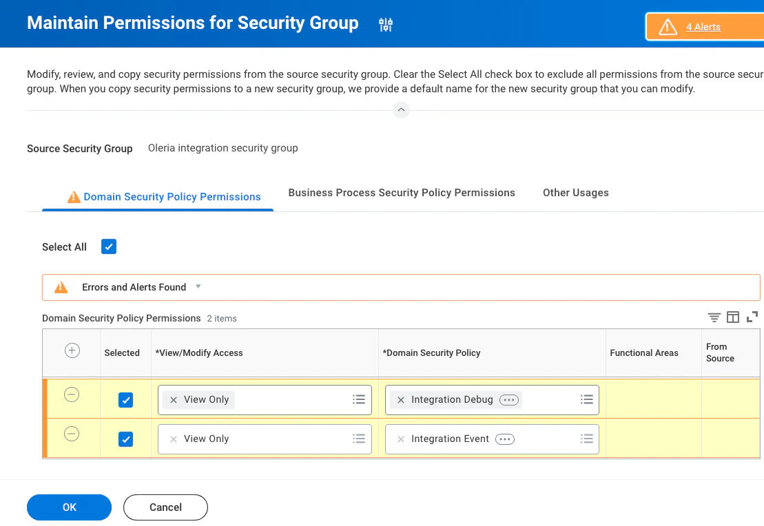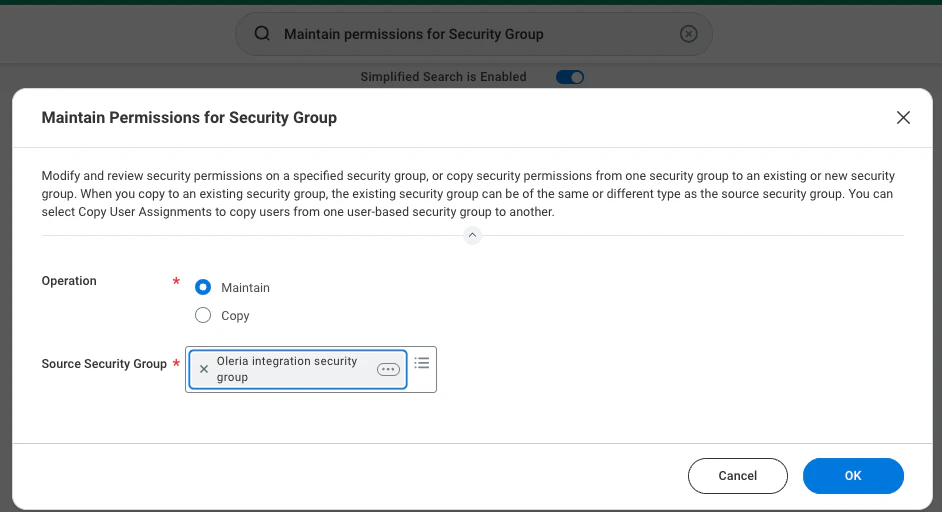In the search window, type **Maintain permissions for Security Group **and select the task. Search and add the Oleria Integration Security Group created in step 1.3 in the Source Security Group. Click Ok.